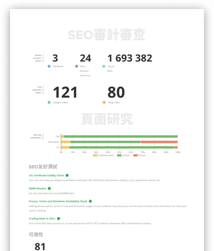 - 網站架構評估,涉及加載速度、安全性和訪客追蹤設置。